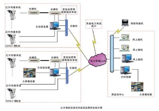 紅外熱成像實(shí)時(shí)在線智能監(jiān)測系統(tǒng)由若干紅外熱成像測溫儀、云臺、網(wǎng)絡(luò)傳輸、監(jiān)控中心工作站計(jì)算機(jī)組成;